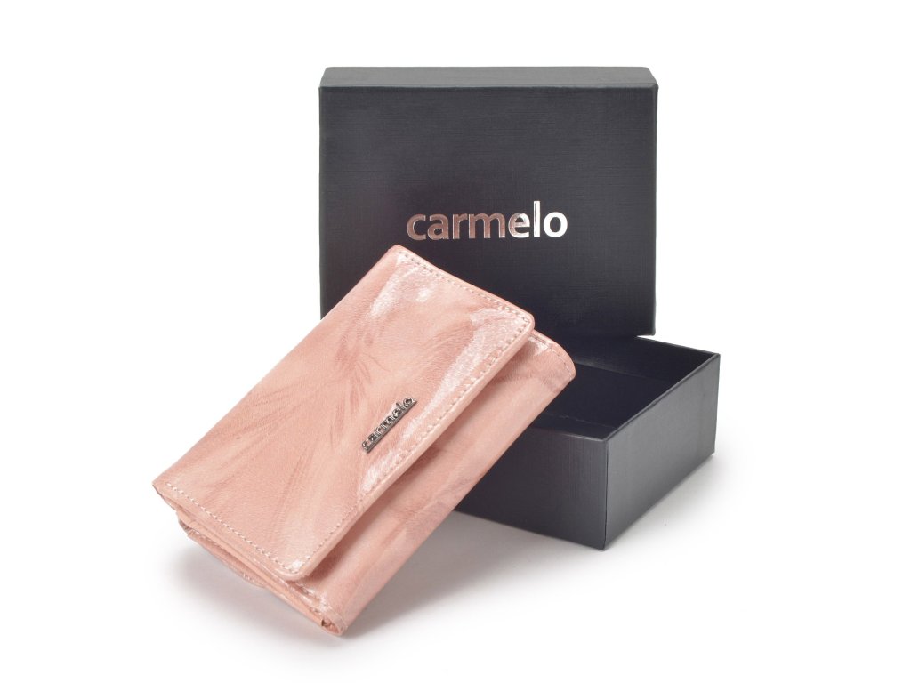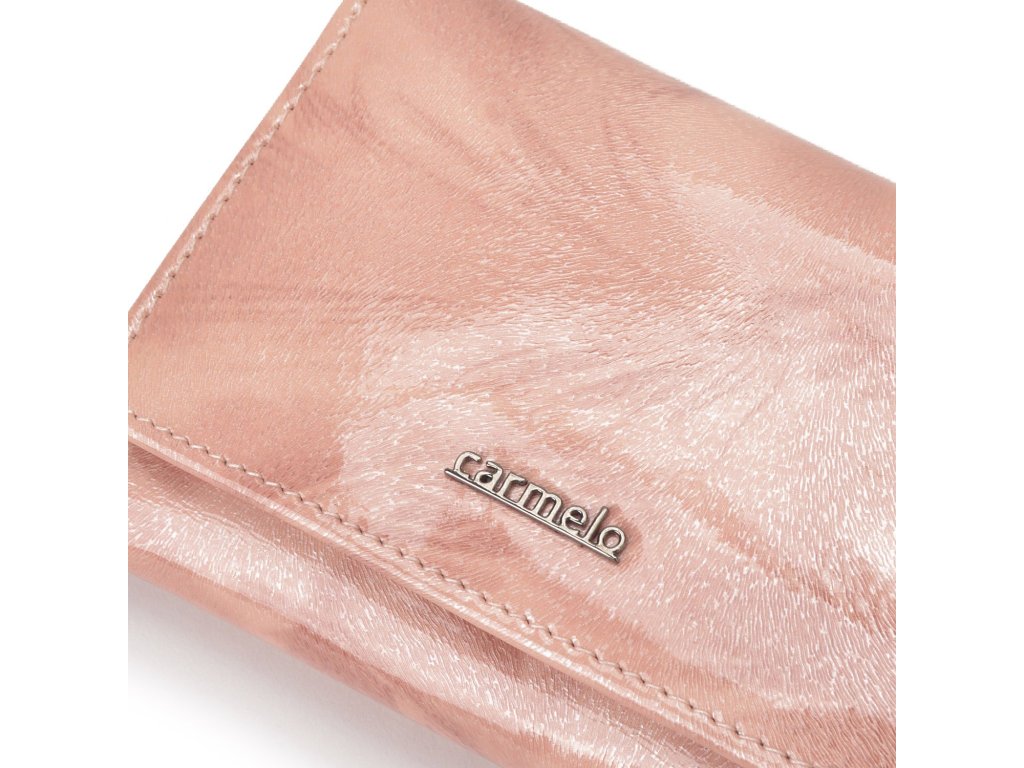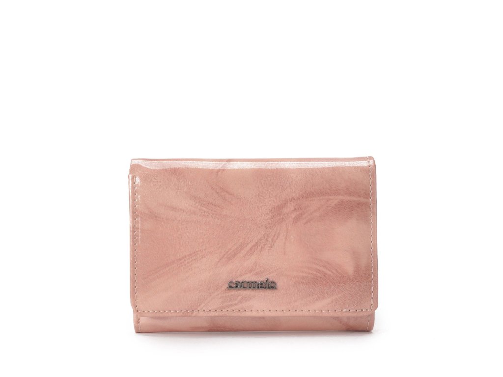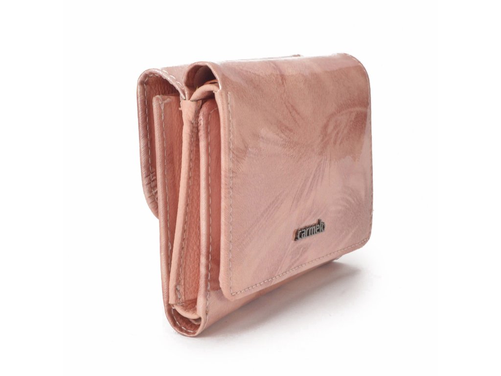 Dámská peněženka Carmelo z lakované kůže s jemným vzorkem. Kabelka disponuje dvěma přihrádkami na bankovkami, kapsičkou na mince a šesti přihrádkami na karty.