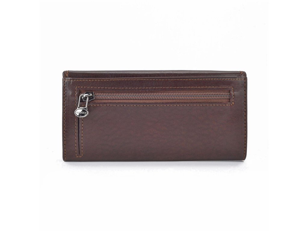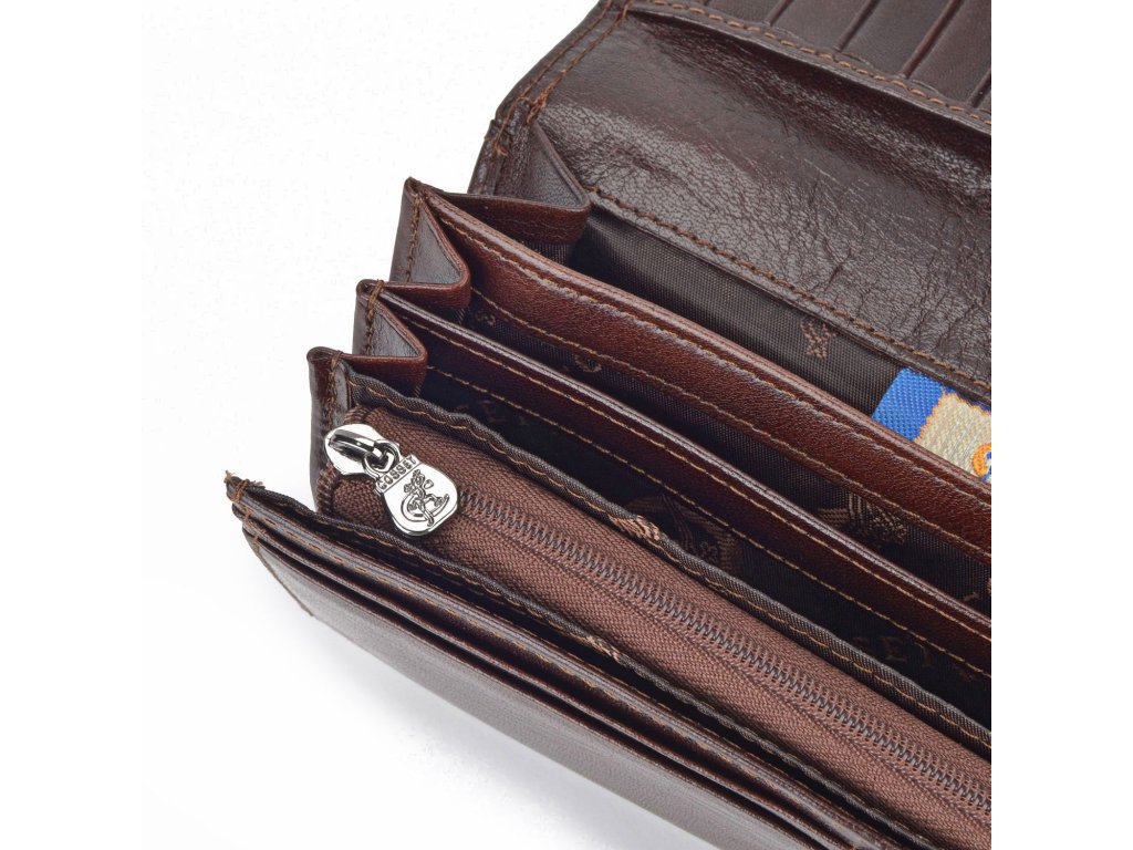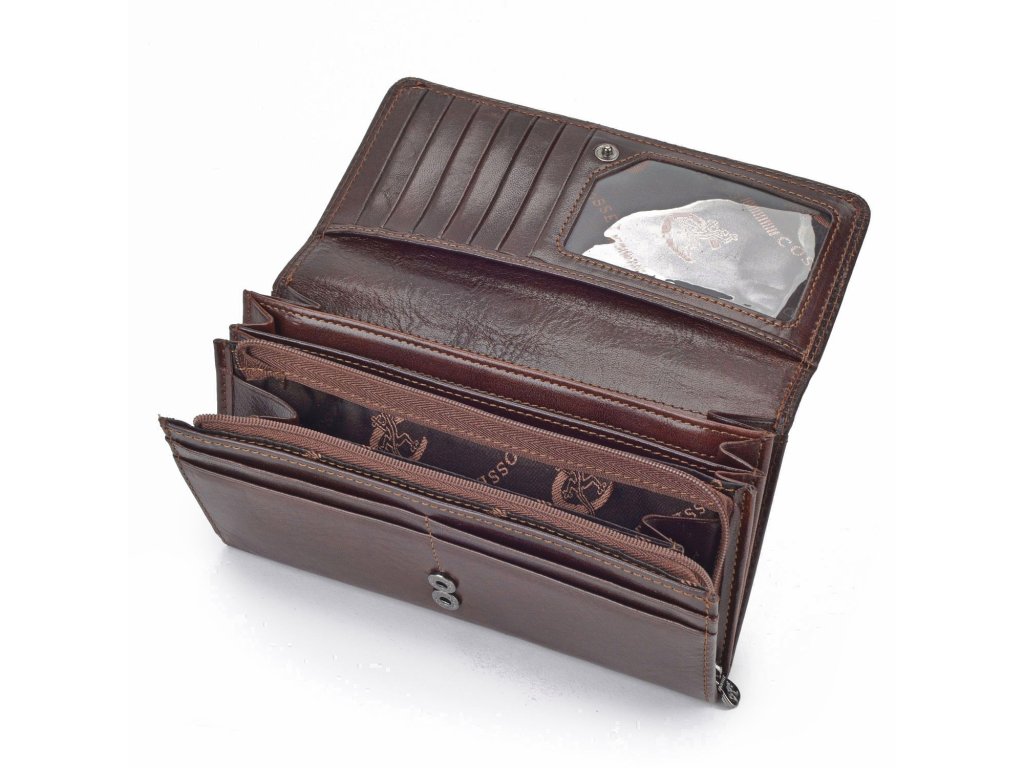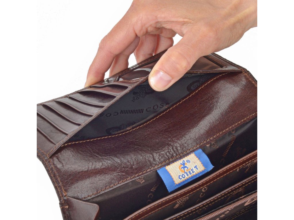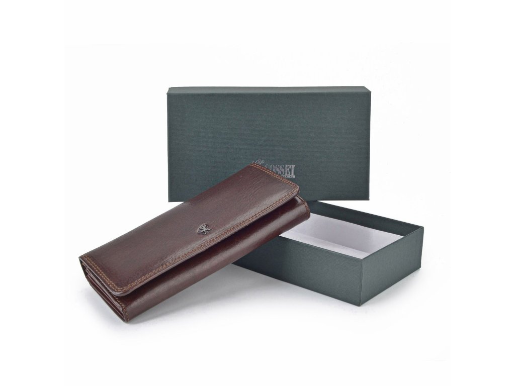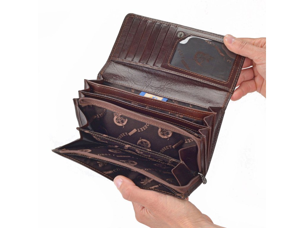Dámská peněženka Cosset Komodo z pravé kůže zdobená kovovým logem. Peněženka disponuje mnoho přihrádkami na karty, kapsičkou na mince, přihrádkou na bankovky a dalšími přihrádkami.