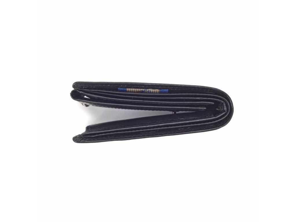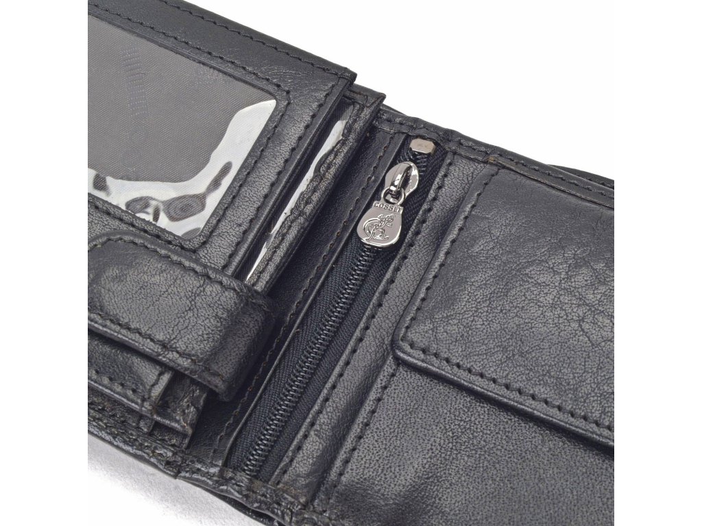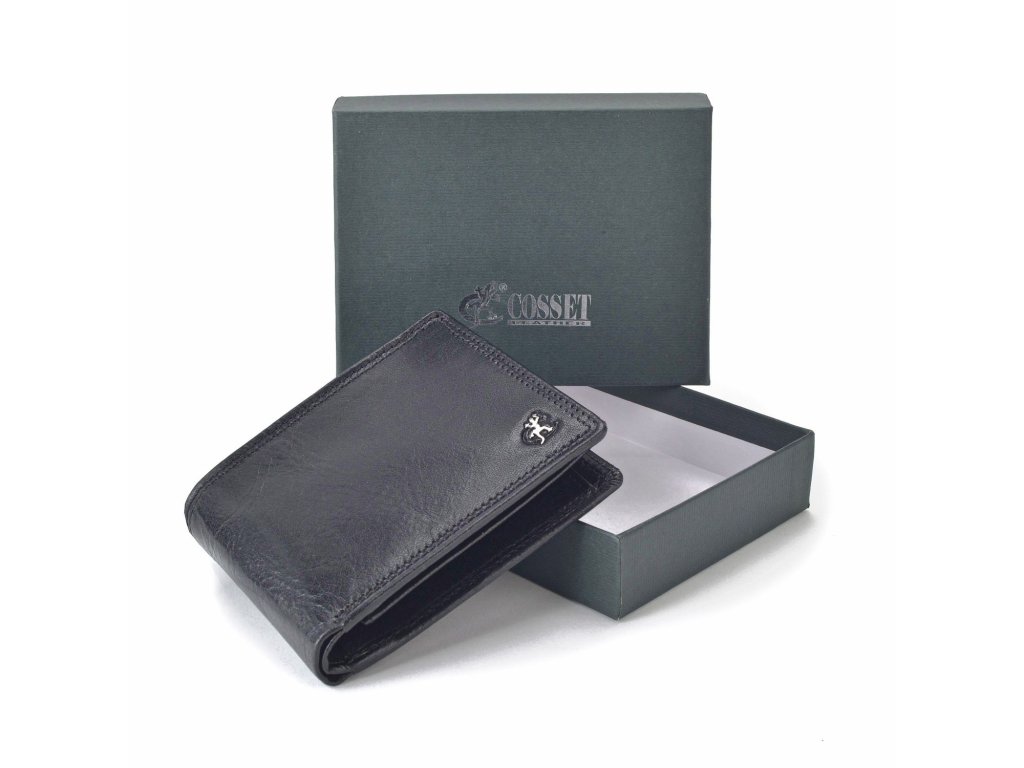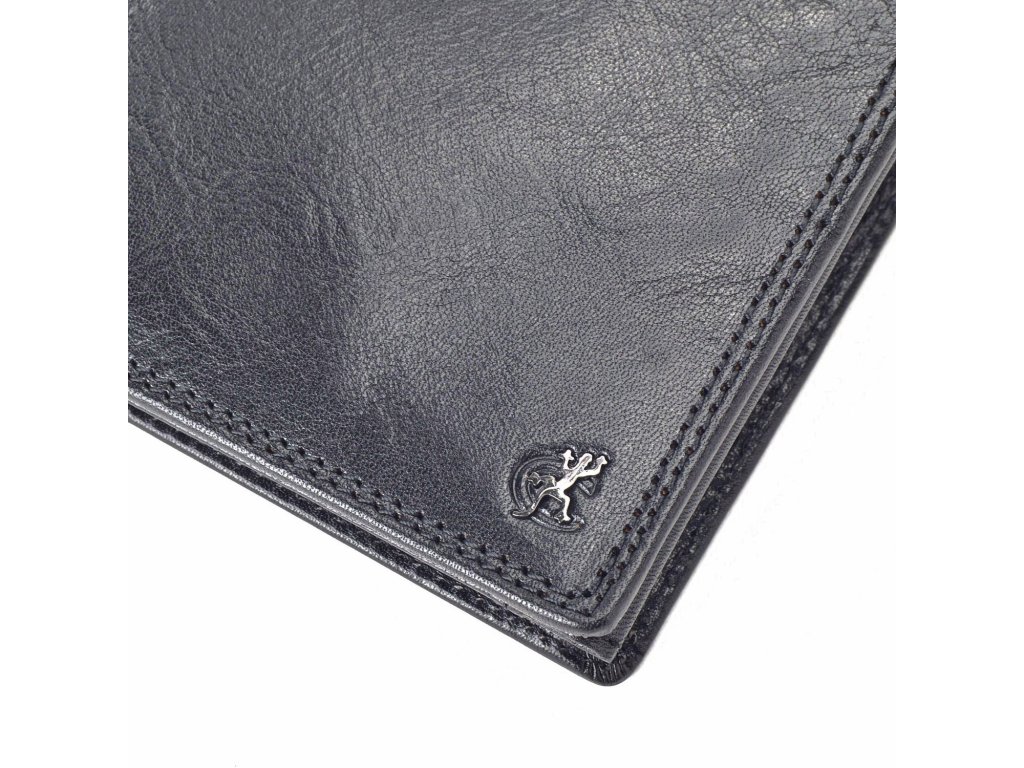 Luxusní pánská peněženka Cosset Komodo z pravé kůže s jemným leskem, zdobená kovovým logem. Peněženka disponuje mnoho přihrádkami na karty, kapsičkou na mince, přihrádkou na bankovky a dalšími přihrádkami.