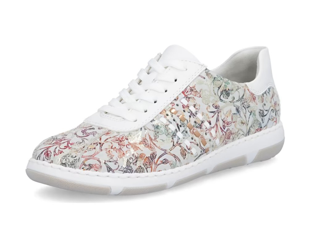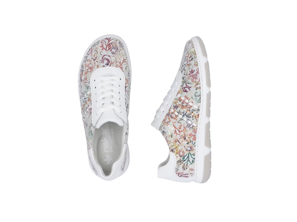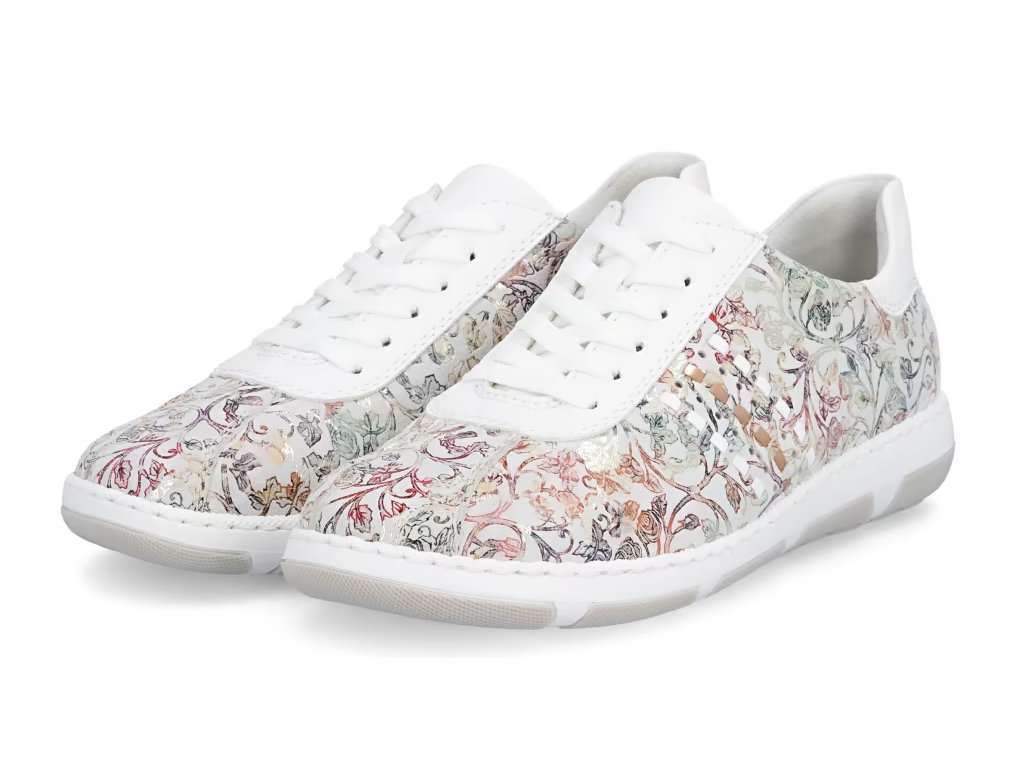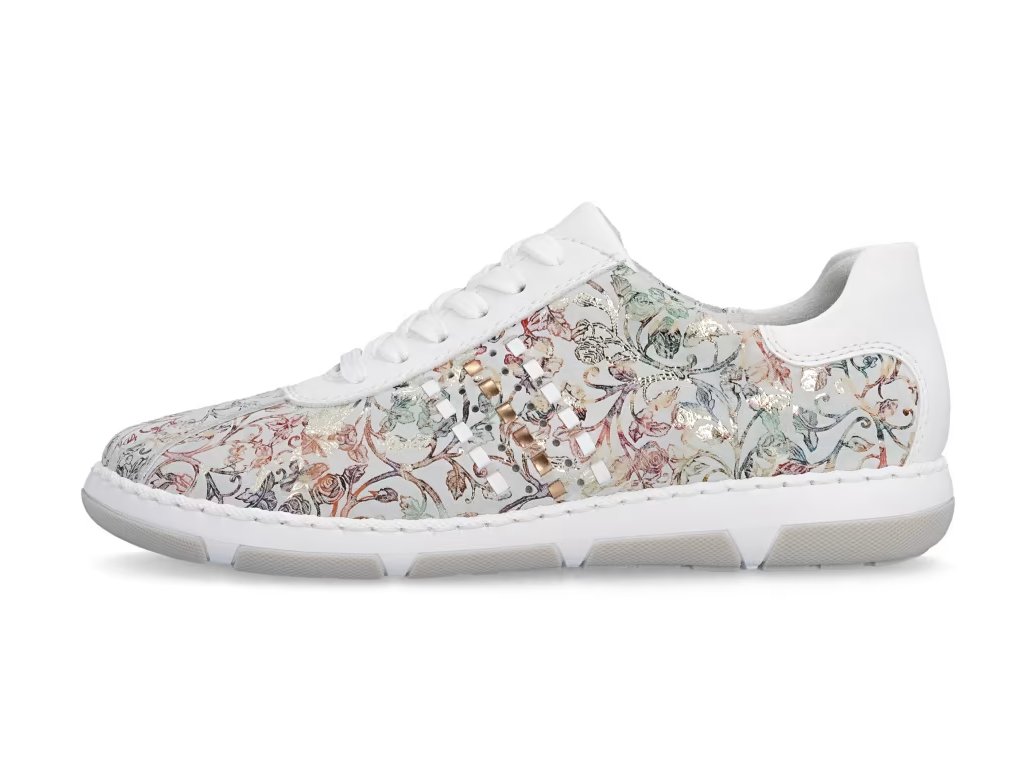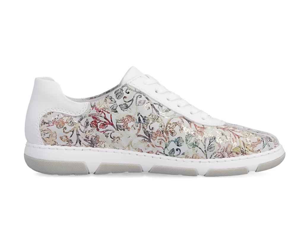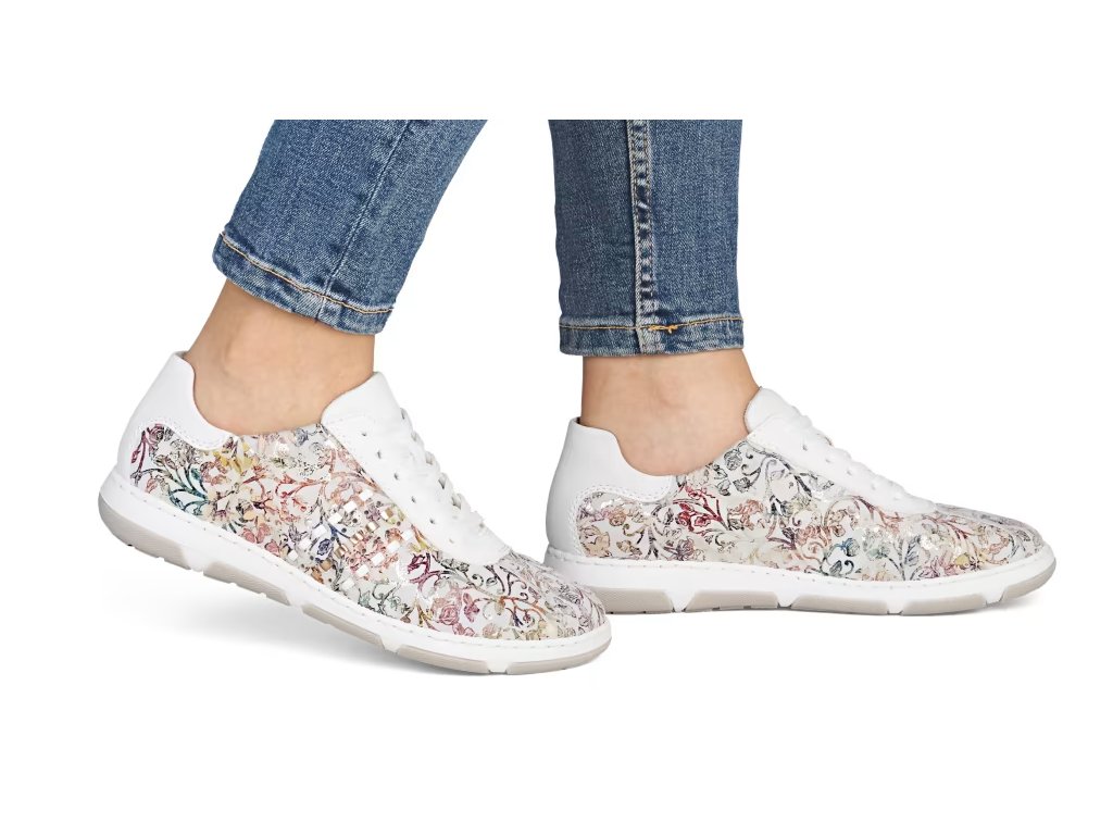 Tyto stylové tenisky od značky Rieker budou skvělým doplňkem do každého botníku. Svršek s barevným květinovým vzorem je obohacen o kontrastní bílé části, které poskytují obuvi svěží a moderní vzhled. Šněrování Vám umožní snadné a rychlé přizpůsobení obuvi, dle požadavků. Vyjímatelná měkká stélka a širší střih bot dodává pohodlí při nošení, což je důležité pro dlouhodobou pohodu při chůzi. Tyto boty si zamilujete a již prostě nebude chtít nosit žádné jiné.