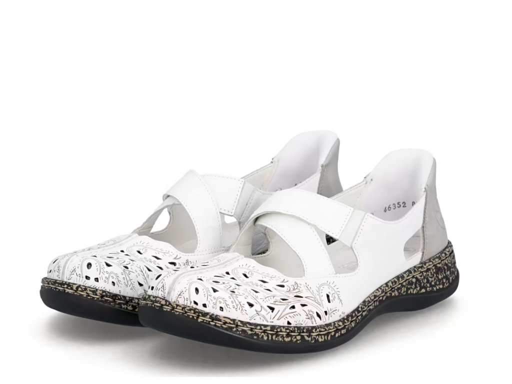 Dámská balerína značky RIEKER je zdobená kontrastním barevným spojením, perforací a vyrytými obrazci na špičce. Pásky přes nárt jsou překříženy, oba jsou doplněné o pružnou gumičku, která usnadní nejen nazouvání, ale také přizpůsobení obuvi na vaší noze. Při celodenním chození oceníte měkkou koženou stélku, která se postará o Vaše pohodlí při každém kroku. Tento model bude vhodný na běžné pochůzky městem či na dlouhých nákupech s kamarádkami.