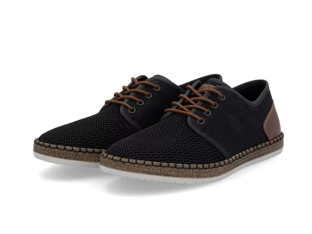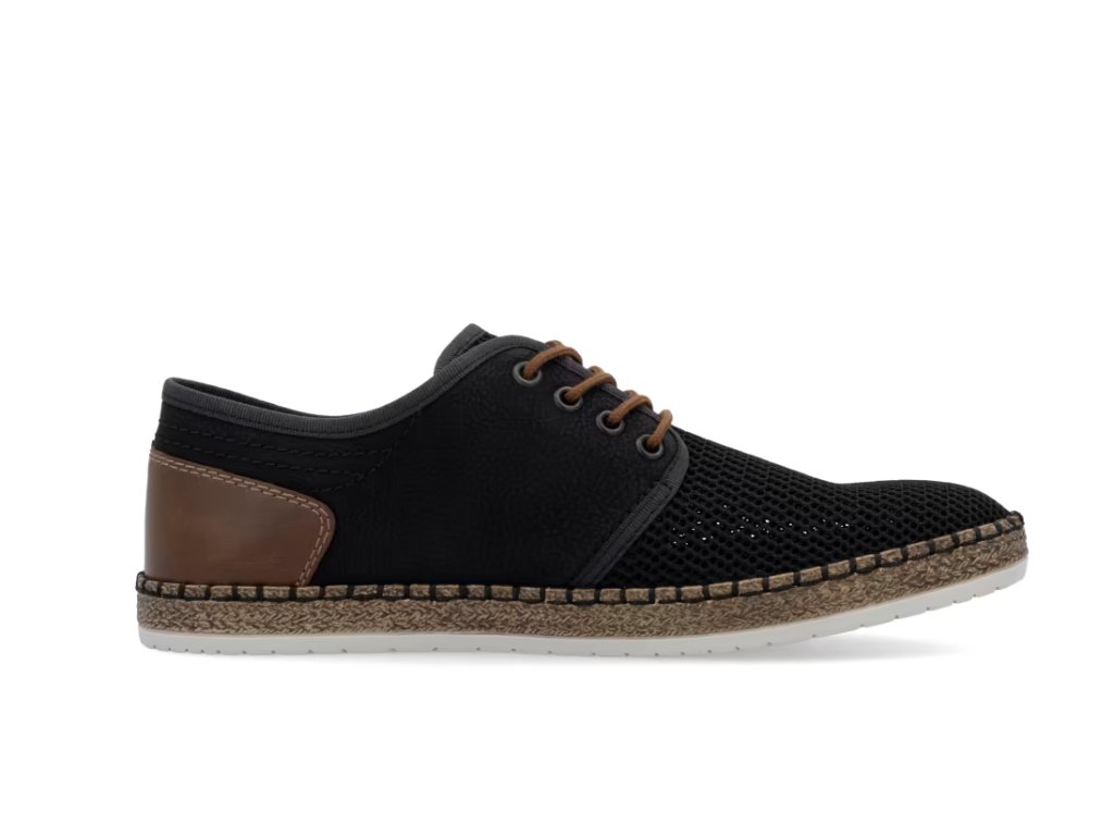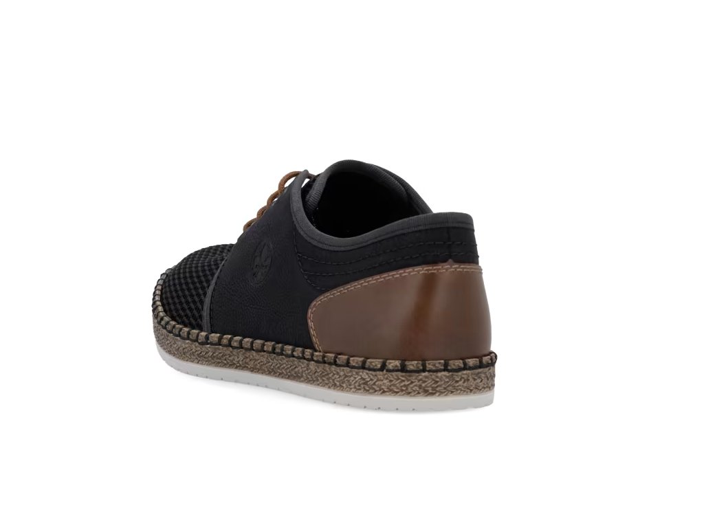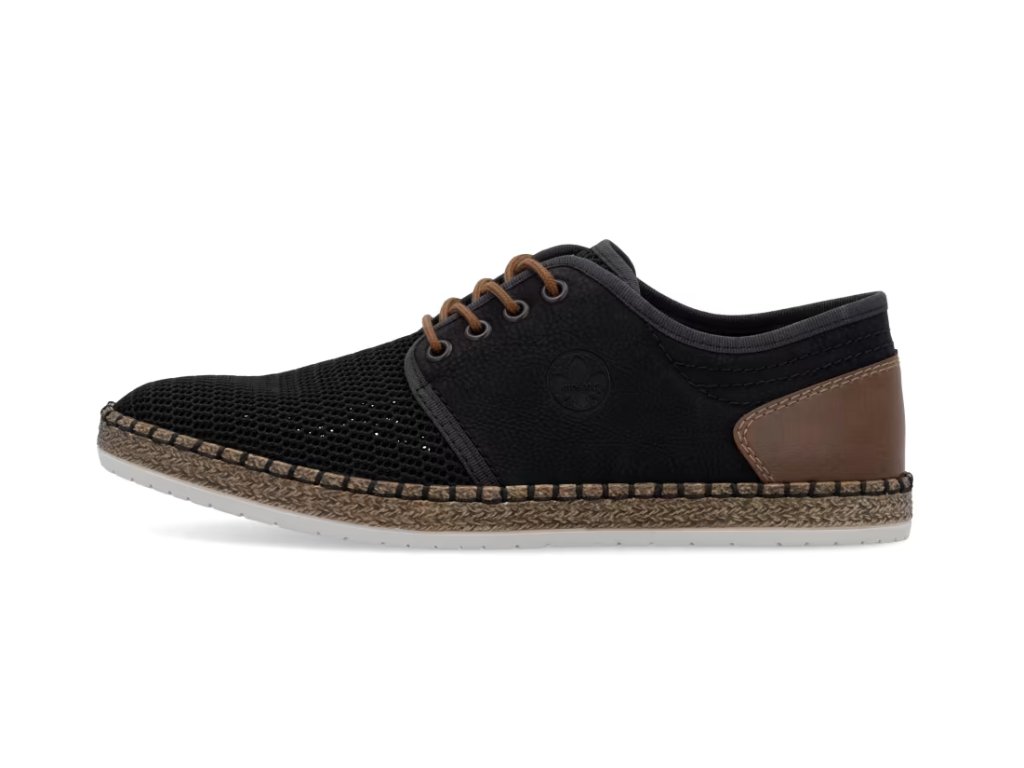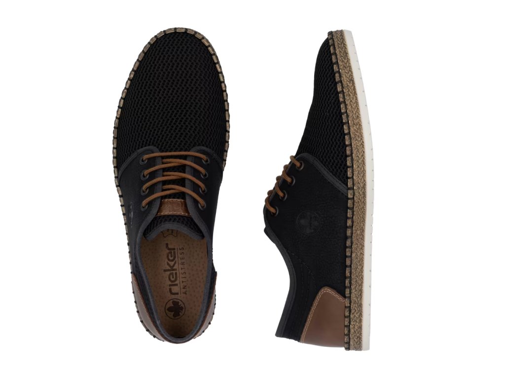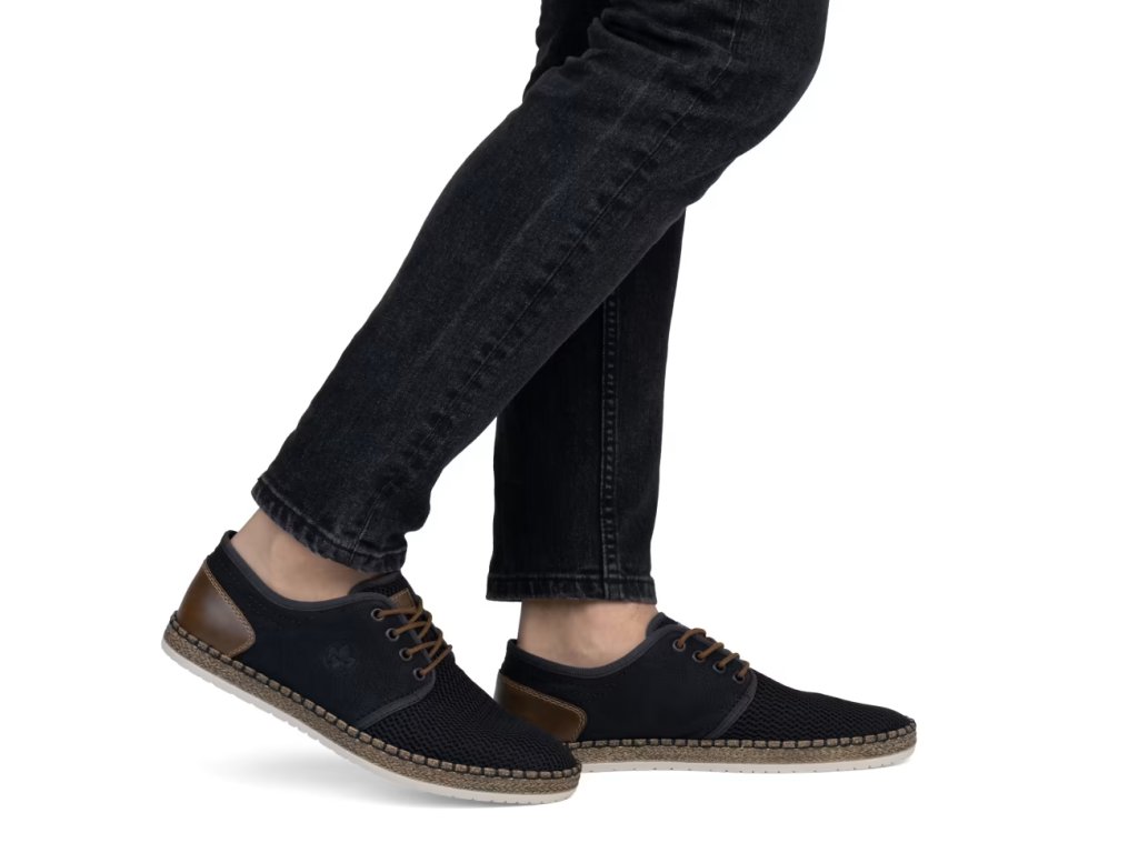 Tato pánská obuv značky RIEKER bude Vaším skvělým společníkem na cestách. Tmavý svršek je vyroben z prodyšného textilního materiálu a je doplněný o kontrastní hnědé prvky a ze zadní strany jemné prošívání. Měkká stélka a podešev vybavená technologií Antistress zajistí maximální komfort při chůzi. K tomuto modelu by se zaručeně hodily pohodlné kalhoty, nebo šortky.