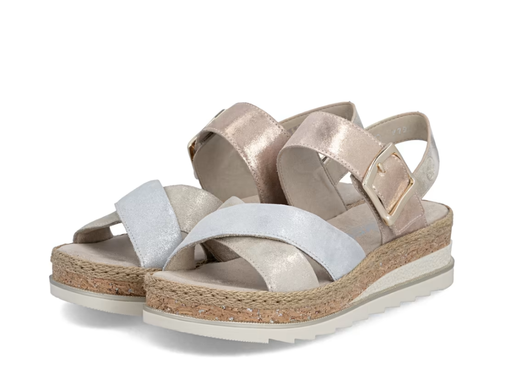 Objevte sandály, které spojují eleganci s maximálním pohodlím – dámský model značky RIEKER je ideální volbou pro každodenní nošení i letní procházky. Design zaujme na první pohled jemnými odlesky materiálu a vkusným barevným kontrastem pásků, které dodávají obuvi moderní a svěží vzhled. Stylový detail v podobě zlaté spony podtrhuje ženskost a eleganci celého modelu. Přední pásky jsou efektně překřížené, díky čemuž nejen skvěle drží chodidlo, ale také opticky zvýrazňují jeho tvar.